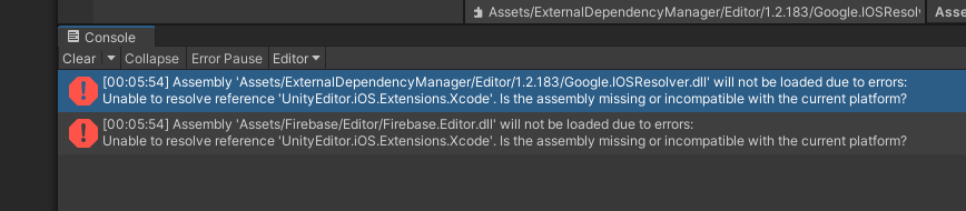 [Unity Error] 'Assets/ExternalDependencyManager/Editor/1.2.183/Google.IOSResolver.dll' will not be loaded due to errors:Unable to resolve reference 'UnityEditor.iOS.Extensions.Xcode'.
